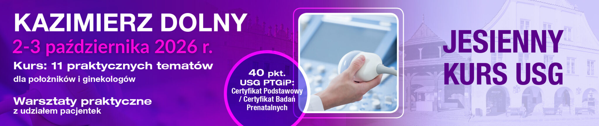 Zapraszamy położników i ginekologów do udziału w Jesiennym Kursie i Warsztatach USG, które odbędą się w dniach 2-3 października 2026 r. (piątek/sobota) w Kazimierzu Dolnym nad Wisłą (Hotel Król Kazimierz). Dodatkowo istnieje możliwość udziału on-line w Kursie 2 października 2026 r. z opcją retransmisji – szczegóły poniżej. Każdy wariant udziału z punktami USG PTGiP.